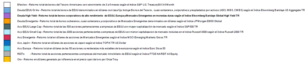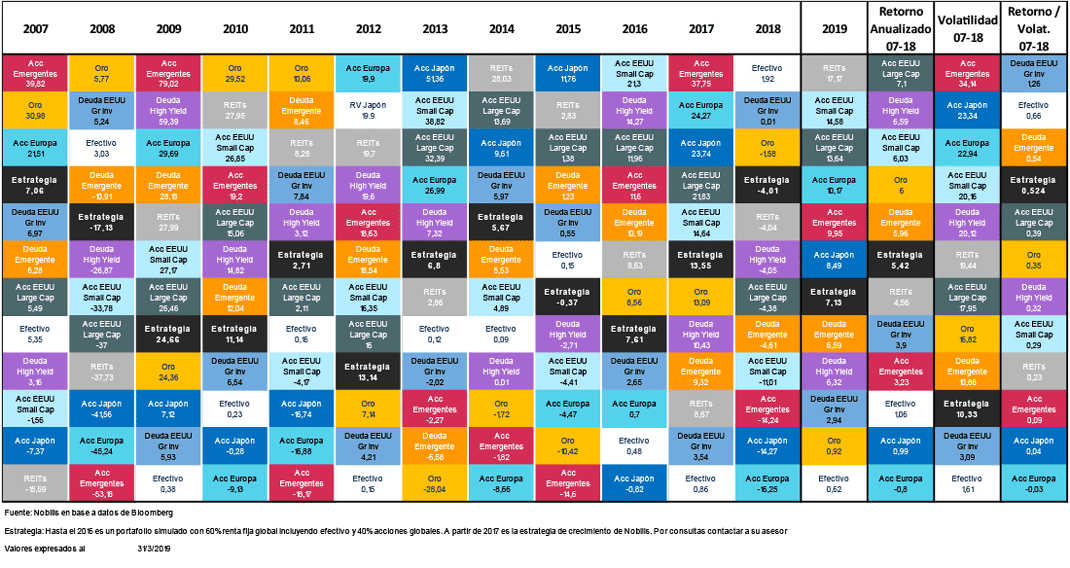 La Tabla de Callan permite visualizar el rendimiento de diferentes clases de activos a lo largo del tiempo. Como puede verse, la Estrategia Crecimiento (“Estrategia” en la tabla) ha mantenido un nivel de rentabilidad atractivo (5,42% anualizado en el período 2007-2018), con un nivel de volatilidad muy inferior a todas las demás clases de activos.